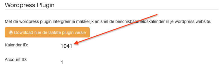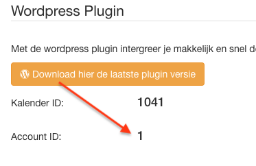 1. Voor de weergave van een combi-kalender heb je je Account ID nodig. Deze vind je op de pagina Plugin code onder het hoofdstuk ‘Wordpress Plugin’: