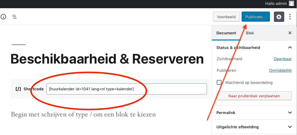 Met de Wordpress plugin van Huurkalender.nl voeg je je beschikbaarheidskalender eenvoudig toe op je eigen website. Zo beheer je gemakkelijk al je online reserveringen en/of boekingen online. In dit document lees je hoe je de beschikbaarheidskalender via de plugin op jouw Wordpress website toevoegt, en hoe je de plugin-mogelijkheden naar eigen wens aanpast.In een paar stappen heb je de beschikbaarheid op je Wordpress website geïnstalleerd. Dit doe je als volgt: Maak een gratis account aan op Huurkalender.nl (https://www.huurkalender.nl/account/) Ga naar het menu Plugin en klik op Plugin code. Installeer de Huurkalender WP plugin op je website, Klik op Activeren om de Huurkalender plugin binnen je website te activeren: Kopieer de Kalender ID van je kalender onder ‘Wordpress Plugin’: Ga vervolgens naar de pagina in Wordpress je waar je de beschikbaarheid wilt weergeven en klik op Bewerken. Voeg op deze pagina de volgende ‘code’ toe als normale tekst [huurkalender id=UW-KALENDERID lang=nl type=kalender] Klik vervolgens op Publiceer en je bent klaar! Je past eenvoudig de kleuren van de beschikbaarheidskalender op je website aan via het administratiepaneel van Huurkalender.nl, zodat het past bij de stijl van je eigen website. Login op Huurkalender.nl Ga naar het menu Plugin en klik op Plugin stijl. Klik op de gewenste kleur in de kleurencirkel. Selecteer een nieuwe kleur. Bevestig de instellingen en je bent klaar. De kleuren worden automatisch aangepast in de kalender op je eigen website. Plugin installatie